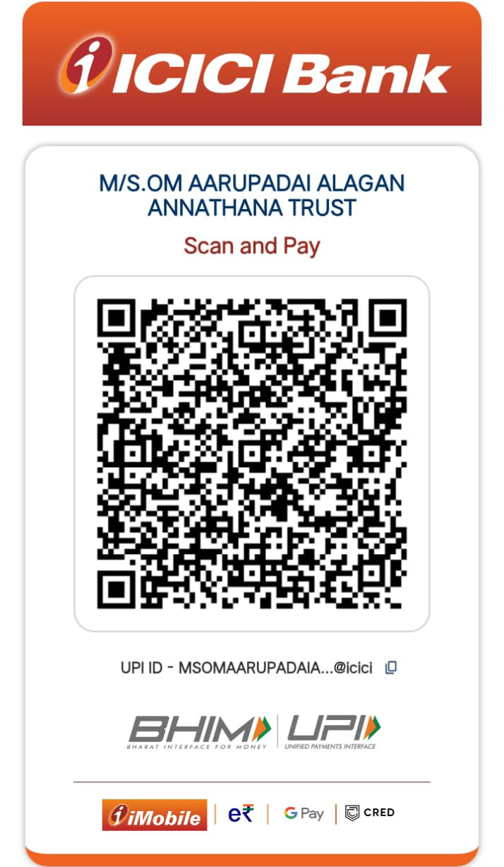Om AaruPadai Alagan Annathana Trust is a registered non-profit charitable organization established with the divine blessings of Lord Murugan (AaruPadai Alagan). The trust was formed with a single noble purpose — to serve humanity through Annadhanam (free food service) and to uphold the values of compassion, devotion, and selfless service.